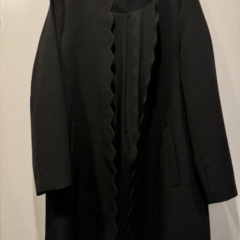 Musta jakku paksuhkoa 100% polyesteriä,satiinivuori.Edessä kaksi ja hihansuissa kolme kangaspäällysteistä nappia.Läpälliset taskut.