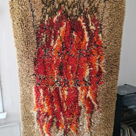 Melko harvinainen Veikko Roikosen suunnittelema Lapin noita -ryijy, ei hajuja tai haalistumia, hyvässä kunnossa. Molemmissa päädyissä taitteet, ylhäällä leveämpi ripustustankoa varten.