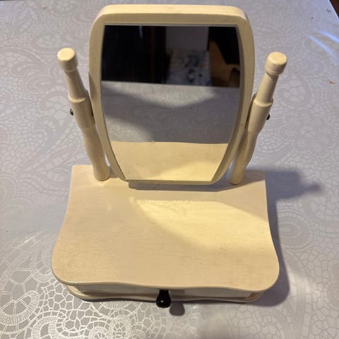 Luonnonvalkoinen kaunis piianpeili kahdella laatikolla. Sopivasti ajan patinaa ja tunnelmaa.
