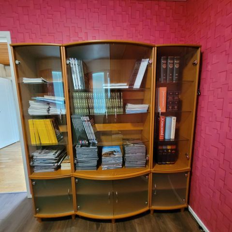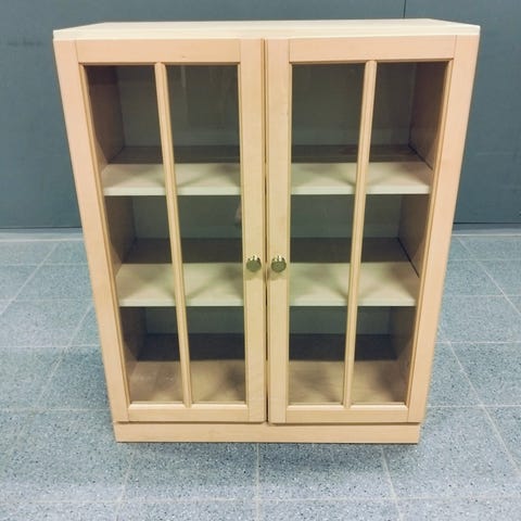 100cm leveä kaappi hyllyillä ja lasiovilla. Hyllyt kannakkeineen 2 kpl molemmin puolin. Suht siisti, mutta vaatii vähän siivoamista. Ovissa lukot, mutta avaimia ei. Kivat metallivetimet.