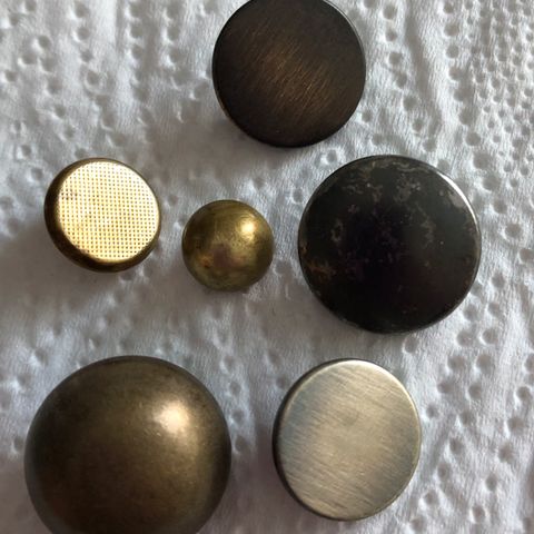 Myydään 4 kpl isoja ja 6 kpl pieniä metalli nappeja. Kapeissa vetoketju kuvio ja väri tummansininen / metalli. Halkaisija 2,2 cm ja 1,7 cm.