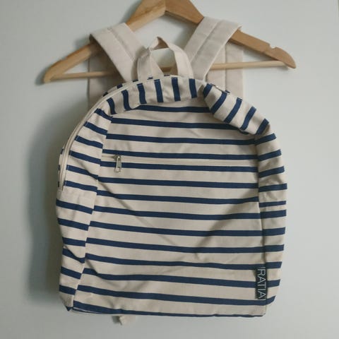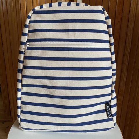 Rento vuorellinen puuvillainen klassikko-raidallinen reppu. Väri beige/sininen. Repun mitat ovat: lev.26 cm , kork. 35 cm , syv. 12 cm. Repussa edessä vetoketjullinen tasku