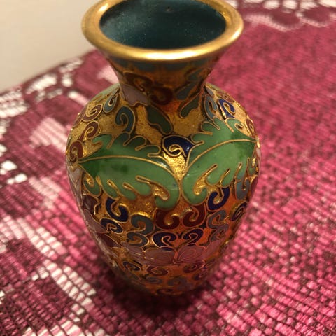 Erinomaisessa kunnossa oleva iso sininen kiinalainen Cloisonne emali maljakko, korkeus 19 cm ja halk. 9 cm ., hinta 15 e. + pk