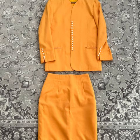 Myydään erinomaisessa kunnossa oleva koon 38 Laurelin vintage-jakkupuku, johon kuuluu pystykauluksinen ja lyhythihainen yläosa, hame sekä eläinkuosia oleva ja sävyihin sopiva lyhythihainen body.