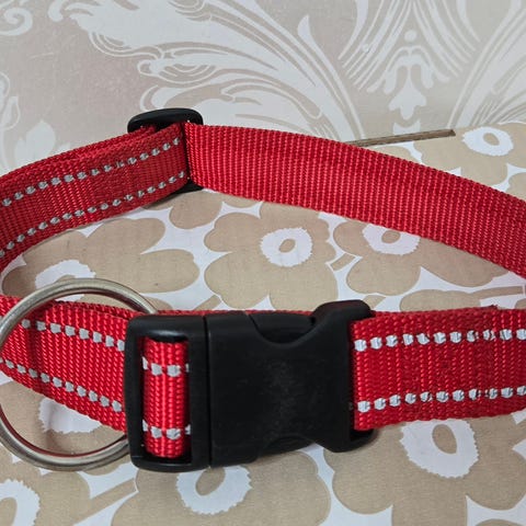 Aitoa nahkaa oleva ison koiran kaulapanta. Pannan pituus on 62 cm. Leveys 3 cm.