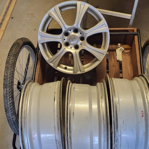 Vanteet ehjät ja suorat. 2 niistä juuri soodapuhallettu ja maalattu, viides vanne on savunharmaa