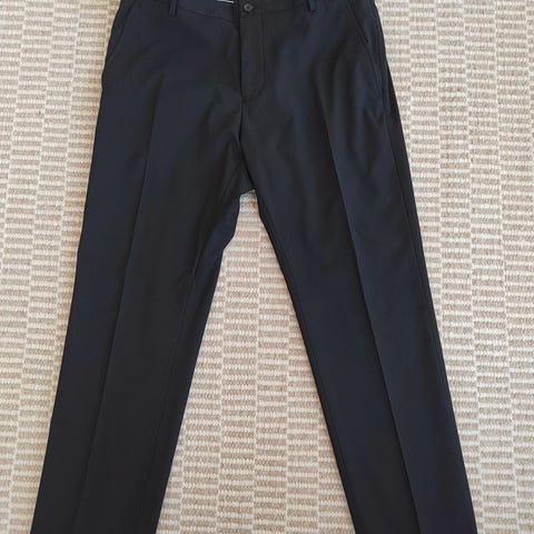 Siistikuntoiset mustat puvunhousut, joista lahkeita lyhennetty. Kokolappu leikattu pois, menee S-kokoiselle. Suora malli.