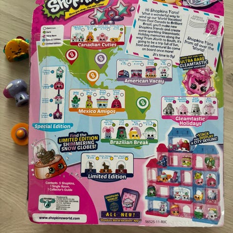 Shopkins kausi 8 World Vacation. Settiin kuuluu 9 shopkinssia ja kolme talon muotoista laatikkoa, jotka voi kiinnittää toisiinsa. Shopkinssit ovat maailman ympäri matkan teemaisia. Kaikki shopkinssit ovat erinomaisessa kunnossa.