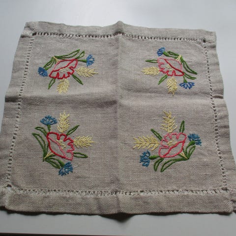 merkattu liina.. käsin merkattu pöytäliina.. kukkaliina pitsireuna