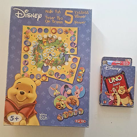 Myydään Disney ensimmäiset värini nalle puh peli. Peli sisältää 24 korttia, 4alustaa ja säännöt