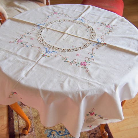 Kuvan vanha ja kaunis käsin kirjailtu suojapeite pyyheliinatelineeseen. Pitsit helmassa ja taitoksessa.