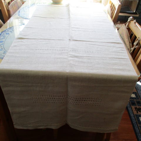 Kuvan hyväkuntoinen ilmeisesti puolipellavaa oleva vaalea pöytäliina.