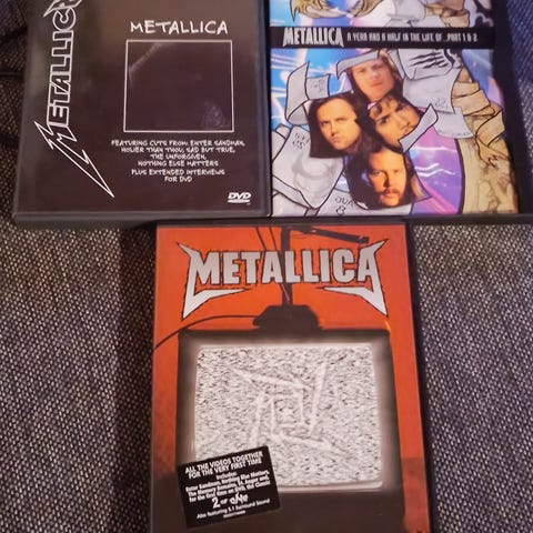 Avaamattomana hyllyssä säilytetty harvinaisempi Metallican kolmen dvd:n livekokoelma.