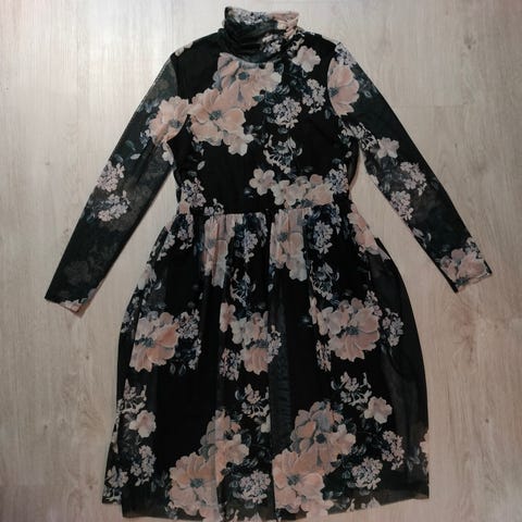 Myydään uudenveroinen NOW-merkkinen kukkamekko. Sini-valkoinen kukkakuvio mustalla pohjalla. Hihansuissa napit. Helmaosan yläreuna joustava.