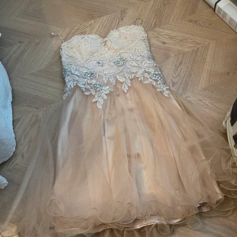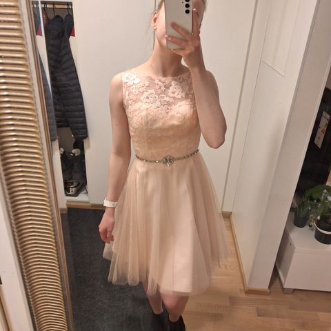 Vaatehuoneen tyhjäystä. Ihana ja hyväkuntoinen, kerran käytetty, juhlamekko/rippimekko. Mekon käyttäjä ollut n.165cm ja kooltaan XS/S. Kuva 4 otettu valokuvasta ja siksi vääristää mekkoon raitoja.