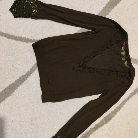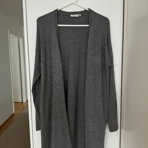Harmaa No-Na neuletakki, jossa on selkäpuolella vetoketjun takana kaunis pitsihelma. Kokomerkintä puuttuu, mutta vastaa kokoa M. Edessä napit. Selän vetoketjua voi pitää kiinni tai auki, auki ollessa malli on väljempi.