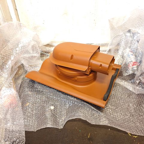 Tiilikaton läpivienti. Tuuletustiili sopii myös helposti aurinkopaneeli asennukseen. Kaapeleiden veto kulkemaan tiilien alla siististi saadaan näin.