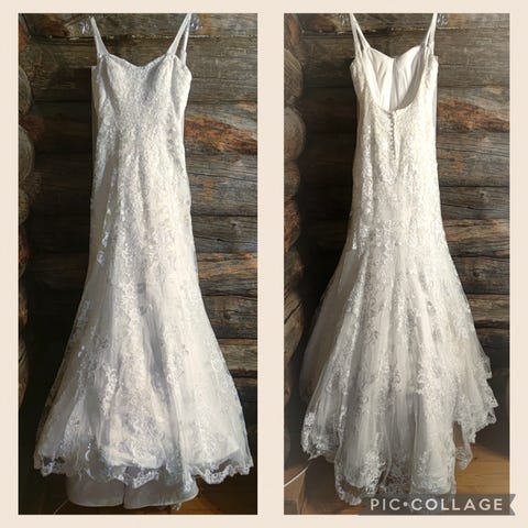 Ostettu uutena Zarabellasta, koko UK 6, (36-38). Väri Ivory/valkoinen. Oma pituus 175cm. Kangas Polyesteri 100%. Pitsin, alla, himmesti kiiltävä satiinimainen vuori. Alinmaisena osa trikoo alushame, molemmat täys pitkiä. Olkaimia kevyesti lyhennetty, helposti avattava. Hunnun reunassa kulkee helmikoristeet, kaunis yksityiskohta, kiinnitetään kammalla. Yhdet häät tanssittu, laahuksen saa helposti nostettua ylös. Pesty käytön jälkeen on täysin moitteettomassa kunnossa. Säilytetty sisällä, pukupussissa, saa mukaan. Ota rohkeasti yhteyttä ja tule sovittamaan.