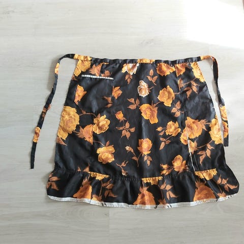 Punainen kukkakuviollinen vintage lasten essu 5-7 vuotiaalle. Yksi nyöri vihreä/vaihdettu.
