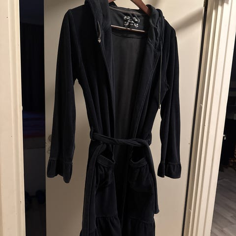 Puna/valkoinen kylpytakki suihkun tai saunan jälkeen. Mukavan tuntuista froteeta. Ehkä kerran ollut päällä,itselle pieni.