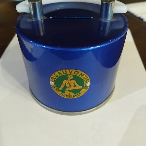 Avaruuskerho säästölipas. Valmistetty 1960-luvun loppupuolella.