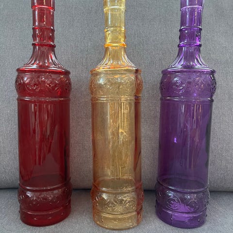 2 kpl suurehkoja litteitä koristepulloja. Keramiikkaa, valkoiset. Toisen korkeus 81 cm, toisen 63 cm. Pullojen leveys n. 17-18 cm. Pienemmän pullon toisessa sivussa pinnoite haljennut (näkyy toisessa kuvassa). Yhteensä 6 €.