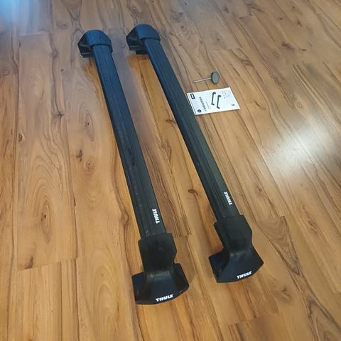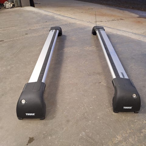Kerran käytetyt kattokaiteet. Sopivat ainakin Volvo XC90 ensimmäiseen sukupolveen 2003–>. Kaideväli noin max 115cm, min 97cm. Telineet kiristetään mukana tulevalla erikoisaivaimella,
