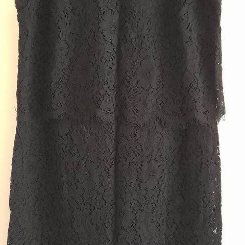 Musta alaosa ja mustavalkoinen pitsinen yläosa. Vetoketju takana. Vatteessa ei mitään merkkiä.