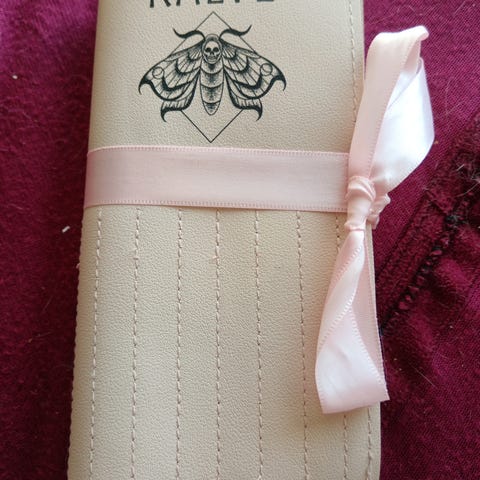 Tummanpunainen meikkilaukku. Käytön jälkeä on. Ehjä ovat. Avautuu hyvin, näkee helposti sisällön.