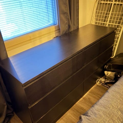 Hyvä Ikea Malm lipasto. Toimii myös yöpöytänä. Keulassa tarrajäämää.