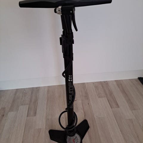 Kuvan mukainen tarpeettomaksi jäänyt toimiva pumppu. Ilma sujuvasti suhahtelee renkaaseen pumpatessa, eli oikein toimiva peli. Hae heti pois.