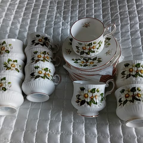 Myynnissä kuvan valkoiset kahvikupit jossa kultaiset reunat.