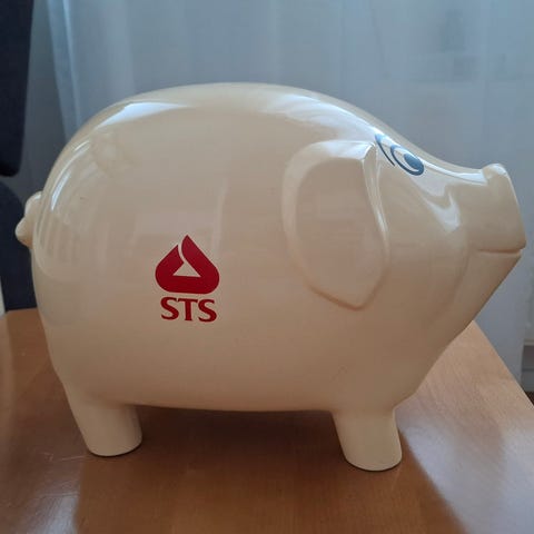 * Isokokoinen punainen STS säästöpossu. Tämän molemmille sivuille liimattu tarrat, säästöpossun pinnassa naarmuja.