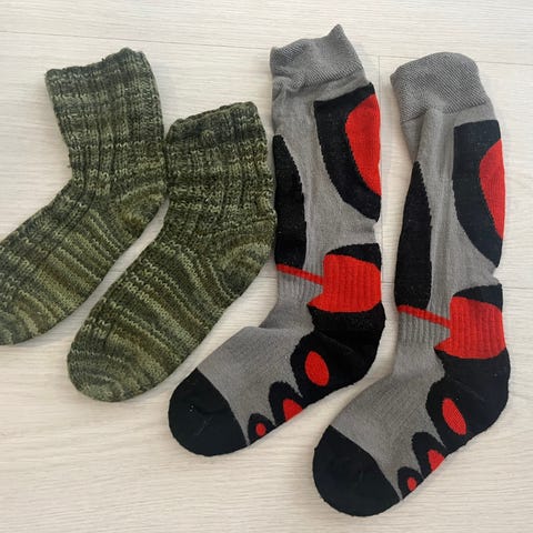 Harmaat pitkävartiset villasukat. Jalkapohjan pituus n. 15cm, varren pituus jalkapohjasta yläreunaan noin