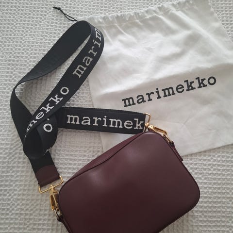 Marimekon pikku laukku. Kunnoltaan kuin uusi. Mitat: korkeus n. 17,5cm ja leveys leveimmästä kohtaa n. 18cm.