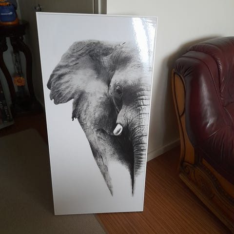Komea ja värikäs lasitaulu Norsun kuvalla. 100x100 cm. Kiinnitetään kulmiin tulevilla kromisilla pyöreillä pitimillä, joiden alle ruuvit seinään.