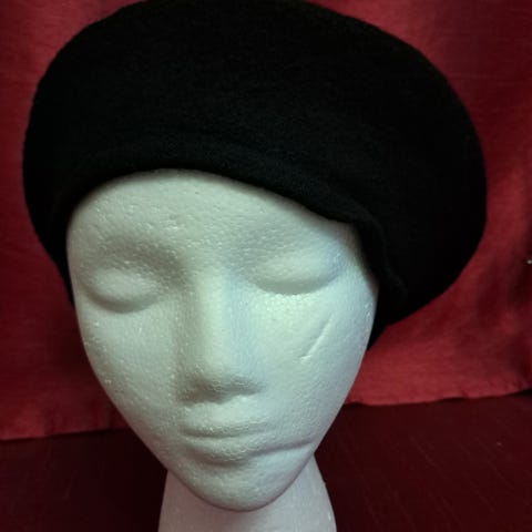 uuSI hieno musta baskeri,, sen halkaisija on 28 cm ja sopii aina 58 päähän.. ja siinä on teksti ja lippu..