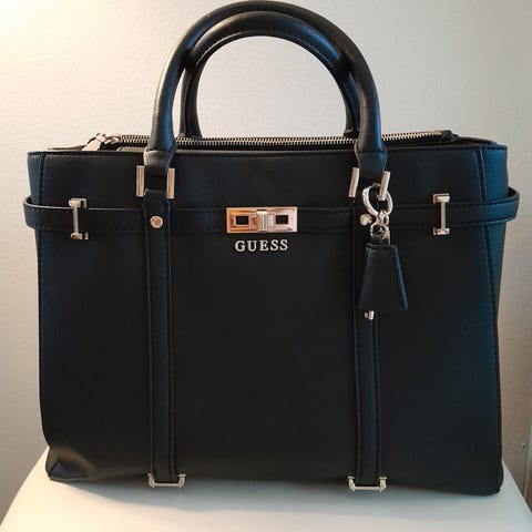 Tummaruskea Guess logo shopperi 32x40, sisällä sisälaukku 20x32 vetoketjulla. Tyylikäs ja käytänöllinen setti. Nouto 00250.