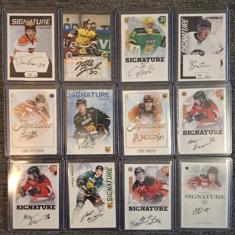 AITO NIMMARIKORTTI +I5 korttia. 1 kortti aidolla nimmarilla varustettu kortti. Sain sen nimmarin ITSE ( myös sain Jari KURRI) Kuusamon jäähallissa joskus 10-luvulla Venäjän maajoukkueita vastaan. Suomella oli mukana muun muassa myös Juha Ylönen ja Jukka Tammi. Heiltä jäi nimet ottamatta koska minulla ei ollut heidän keräilykorttia