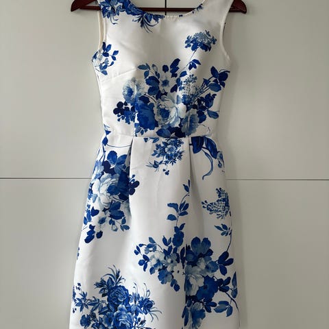 Vähän käytetty juhlamekko, 100 % silkkiä. Väri kulta, luonnonvalkoinen ja musta. Mekon pituus 88 cm. Ympärysmitat rinnasta 77 cm, vyötäröltä 71 cm ja lantiolta 91 cm.