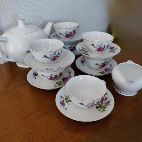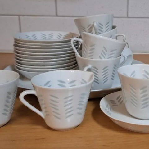 Friedl Kjellbergin suunnittelema ihastuttava Oksa-kahviastiasto. 4kpl kuppeja, 6 kpl asetteja ja 6 kpl kahvileipälautasia (halkaisija 15 cm) sekä tarjoiluvati (halkaisija 27,5 cm). Nouto Laajasalosta.