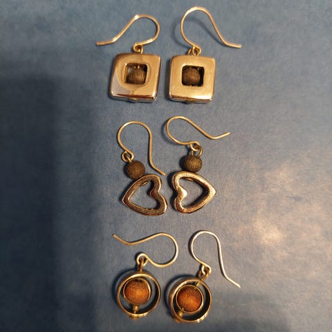 Aarikan puisia, tummansinisiä vintage-korvakoruja. Isommissa riippukorviksissa halk. 4,5 cm, metalliosa hopeanvärinen, hinta 20 e. Napit noin 0,8 cm halk. ja metalliosat hopeaa, hinta 10 e. Yhteishinta 25 euroa (plus mahd. postikulut).