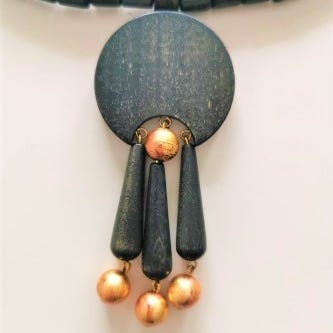 Aarikan musta, puinen/krominen, joustava vintage-kaulakoru. Pituus "lepoasennossa" 55 cm. Hinta 25 e. (Joustava rannerengas ei ole muistaakseni Aarikkaa, joten tulee kaupan päälle, koska sopivat hyvin yhteen. Ympärysmitta "levossa" 18 cm, korkeus 3 cm)