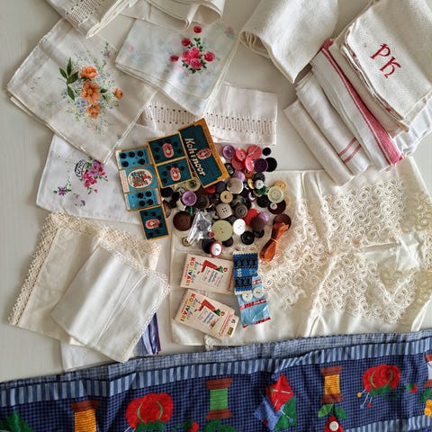 Kasa kankaita, nauhoja, pitsiä ja koristeita