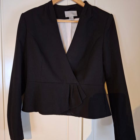 Hyvin laskeutuva vuorillinen musta jakku. Aavistuksen kiiltävä materiaali (44 % asetaattia, 40 % viskoosia, 16 % polyesteriä). Kotimainen Tuomi Tuote Oy. Kunto hyvä++.