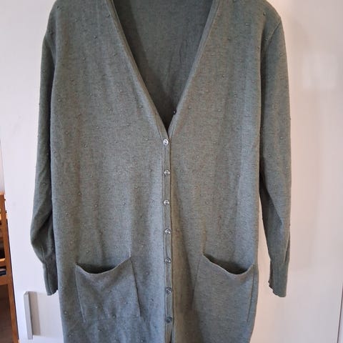 Neuletakki koko XL. Boleromallinen eli lyhyempi helma, joka sopii myös mekon kanssa. Pitkät hihat. Mittoja: kai-kai 60 cm, pituus olalta helmaan 45 cm. Polyesteria. Tätä ei ole käytetty, sain lahjaksi mutta minulle väärän kokoinen. Hinta 5 eur noudettuna Mikkelistä tai Toridiilinä.
