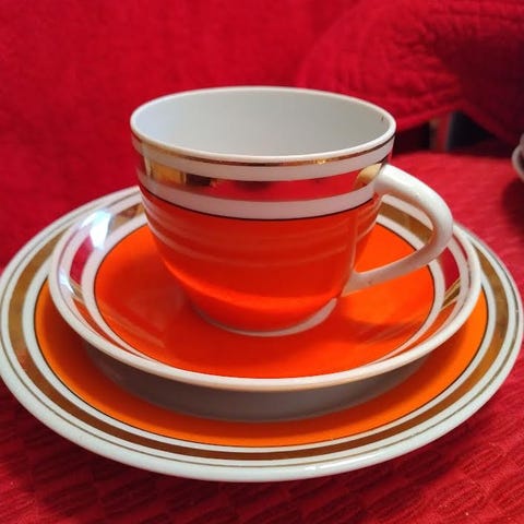 Dulevo -posliinitehtaan kuppi, asetti, leipälautanen sekä kannellinen säilytyspurkki.