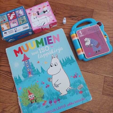 Muumien suosikkihahmot kasseissa, palapeleisdä sekä värityskirjassa.