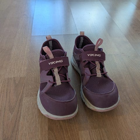 Hyväkuntoiset Vikingin kesäkengät. Tarrasäätö. Pohjallisessa pientä tummentumaa, mutta mielestäni ihan siisti yleisilme. Pohjallista ei saa irti eli vähän hankala mitata, mutta pituus noin 23 cm tai pari milliä yli.