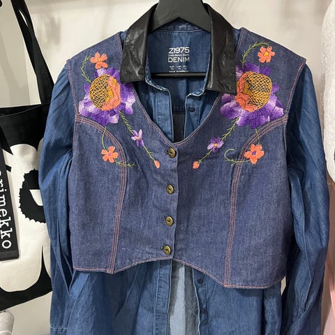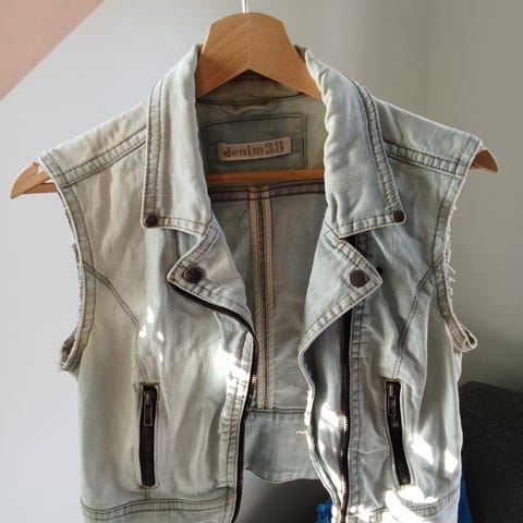 Persoonallinen farkkuliivi. Koko reilu L. Sivuista auki, suljetaan napeilla. Edessä näyttävä kirjailu ja kolme tasku. Vyötärön ympärys nappien kohdalta 2×61cm. Pituus olka-helma 86cm.
